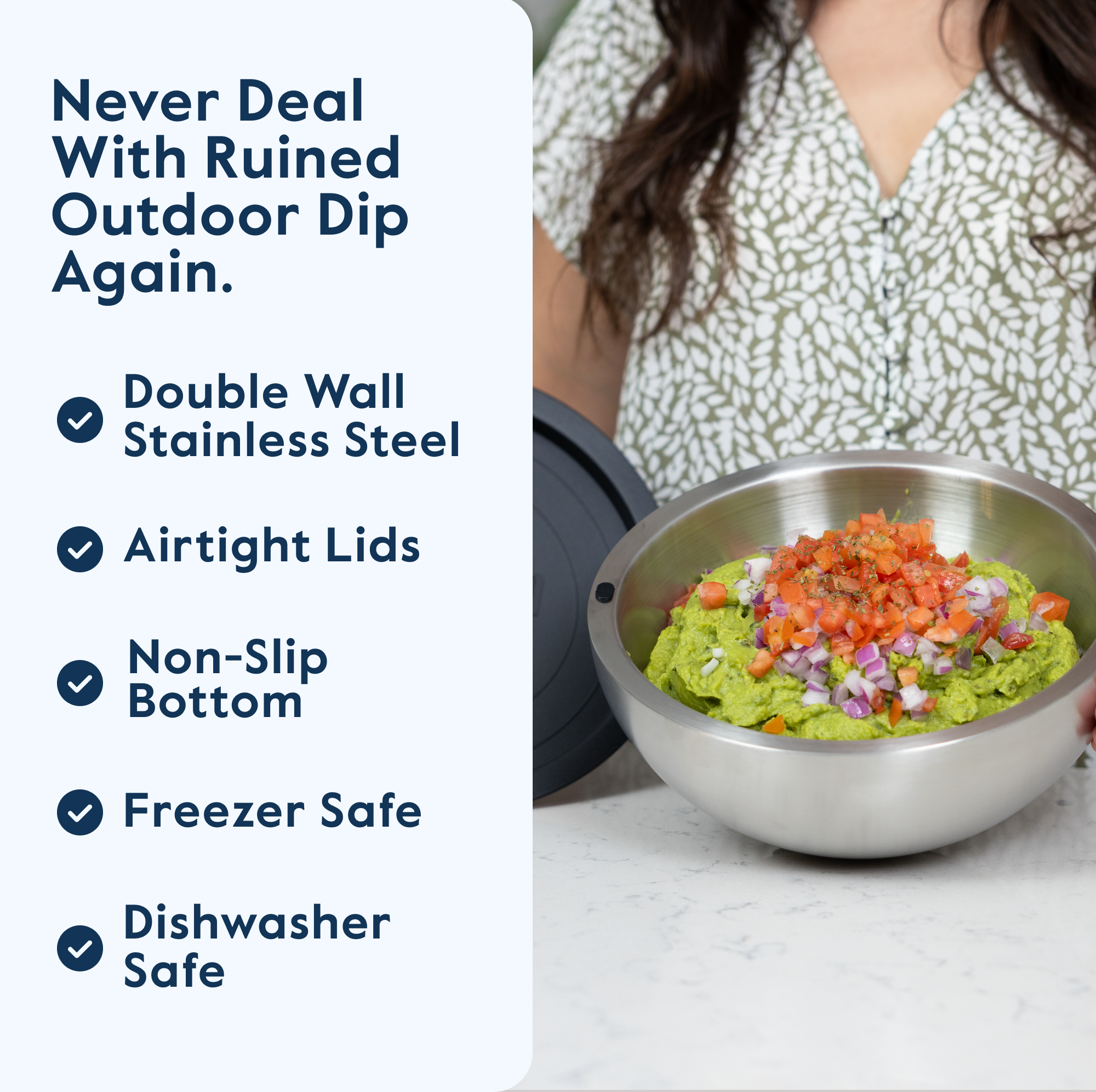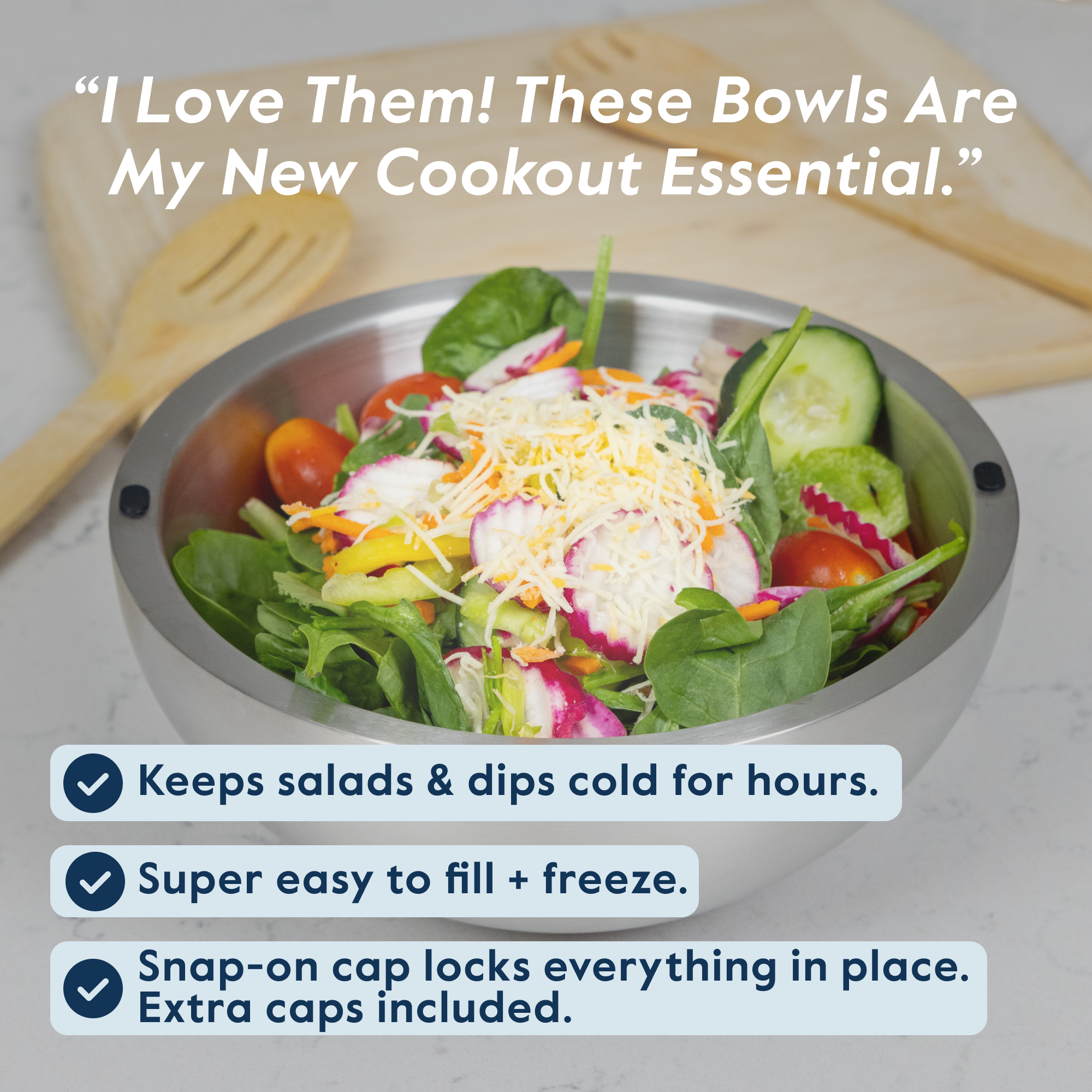 Simply fill the hollow stainless steel walls with water through the fill port, then place the bowl in the freezer. Once frozen, it keeps dips, salads, and more chilled for hours no loose ice needed, and no risk of dilution.